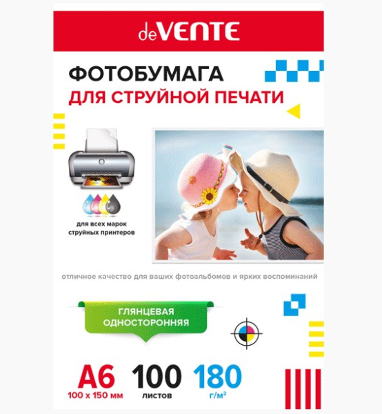Фотобумага для струйной печати 'deVENTE' A6 (10x15 см) 100 л, 180 г;м², односторонняя, 2042903