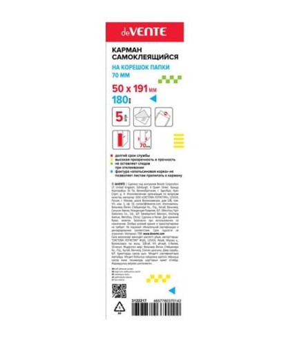 Карман самоклеящийся на корешок папки 70 мм 'deVENTE' 50x191 мм, ПВХ 180 мкм, прозрачный, 3122217