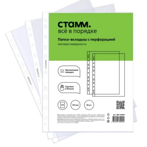 —Папка-вкладыш с перфорацией (файл) 50 шт,СТАММ А4, 110 мкм, матовая, ММ-30989