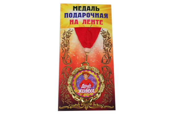 —Медаль подарочная на ленте металлическая Друг жениха D=6,5 см.