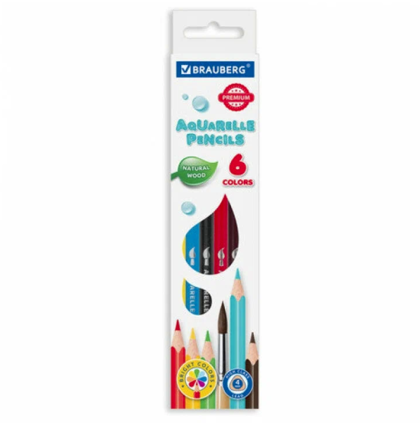Карандаши цветные BRAUBERG PREMIUM AQUARELLE , 06 цветов , грифель мягкий 4 мм, 181670