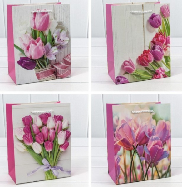 Пакет подарочный с блёстками 'Тюльпаны', 18х23х10, ОМ000312Е