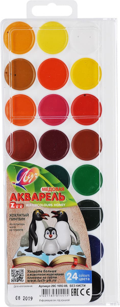 Краски имеют прозрачные, чистые и яркие цвета, хорошо ложатся на бумагу, превосходно разносятся и размываются, быстро сохнут, имеют глянцевую поверхность, изготовлены из натуральных компонентов с добавлением мёда и патоки.