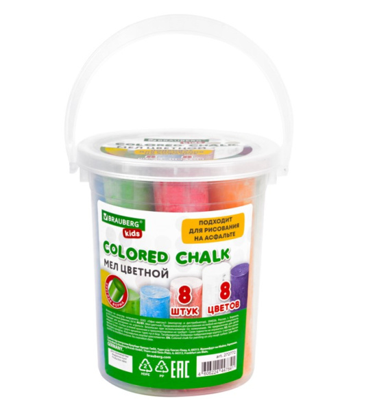 —Мел в ведерке для рисования на асфальте 8 штук, цветной круглый, BRAUBERG KIDS, 272772