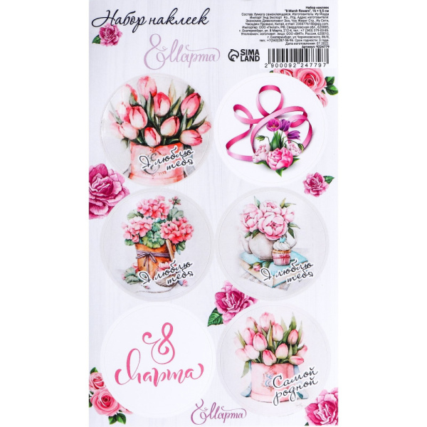 Наклейки для цветов и подарков '8 March flowers', 16 х 9,5 см, 9224779